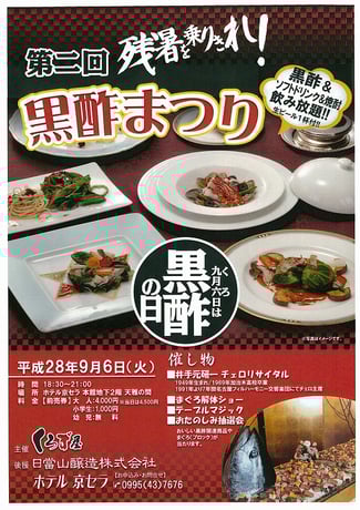 第二回黒酢まつり 第二回黒酢まつりが開催されます 開催日時:平成28年9月6日(火) 18:30~21:00 開催場所:ホテル京セラ 本館地下2F 料 金:【前売券】大人4,000円(当日は4,500円) 小学生1,000円 お問合せ/お申し込み ホテル京セラ 電話0995-43-7676 主催:くろず屋 後援:日當山醸造㈱ ホテル京セラ tagPlaceholderカテゴリ: イベント